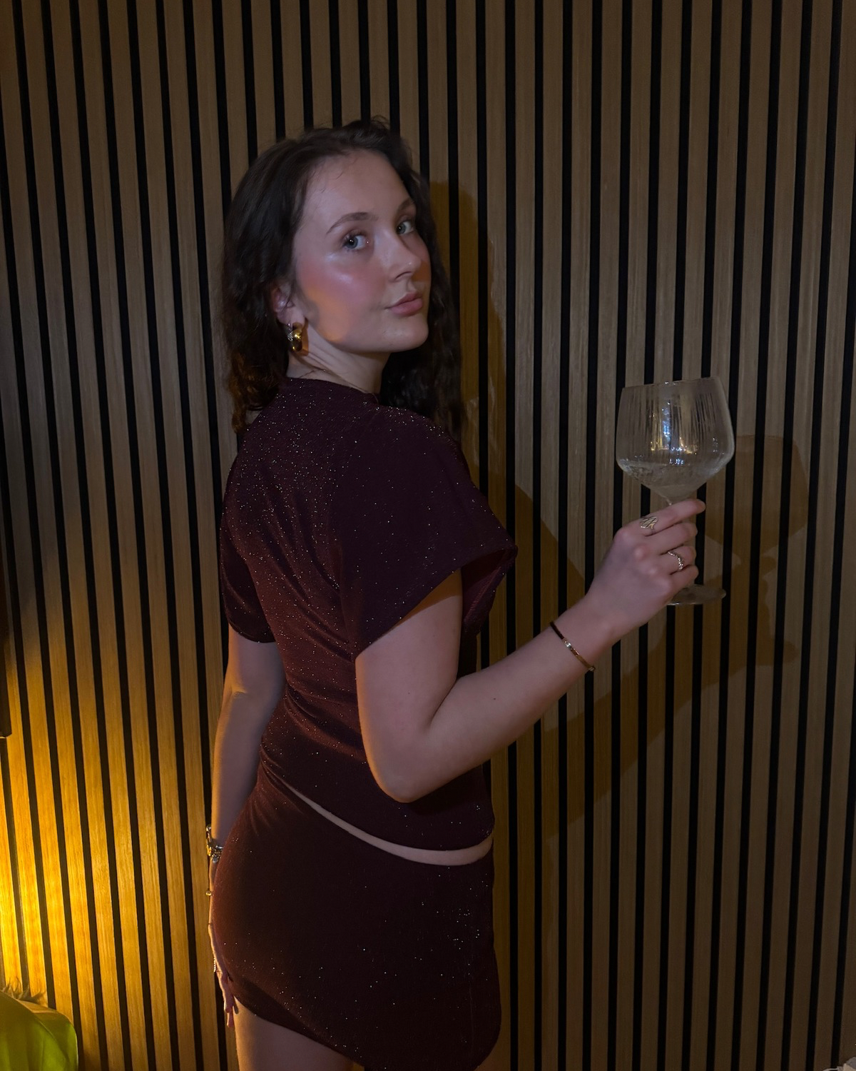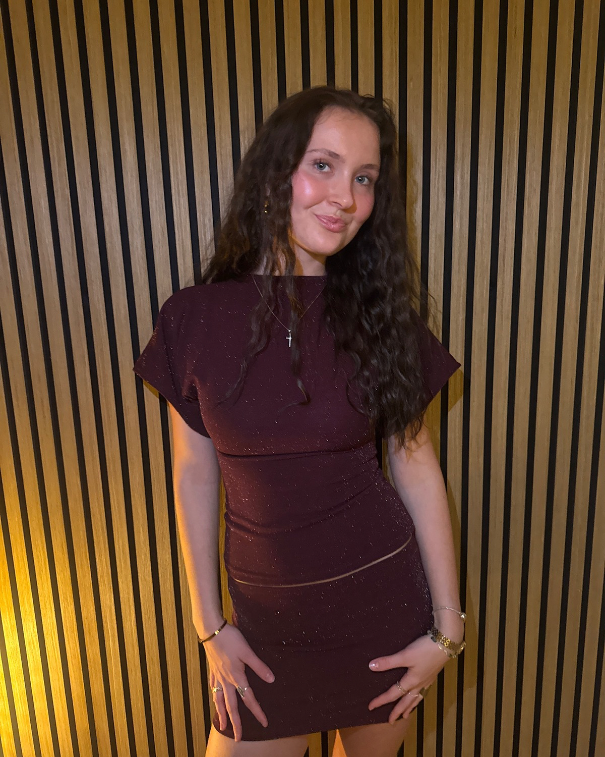 Lisa toppen i mørkerød med shine, perfekt til højtider som jul og nytår. Toppen er strækbar men stoffet er mere kraftigt end de andre Lisa toppe, behagelig mod kroppen.